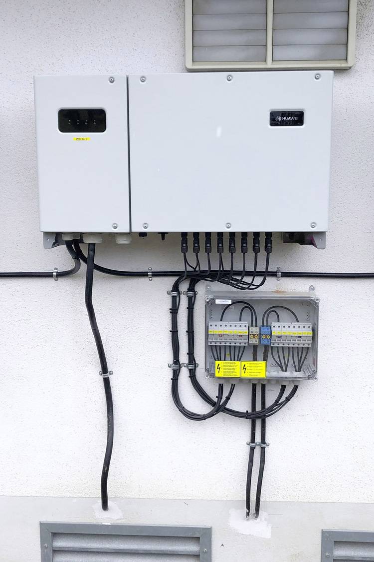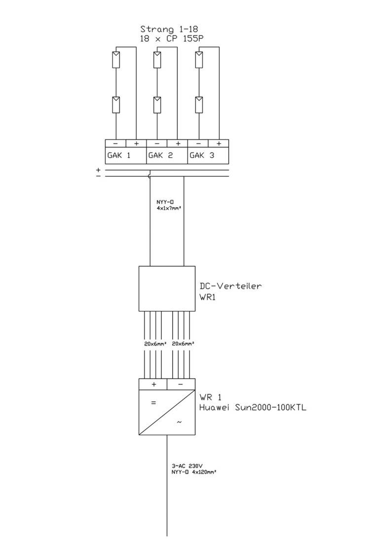 In Rücksprache mit dem Hersteller der Wechselrichter wurde ein DC-Verteiler entworfen, der das DC-Hauptkabel in mehrere Einzelstränge entsprechend den Vorgaben des Wechselrichters aufteilt. Dies bedeutet zusätzlichen Aufwand an Komponenten und Installation, verhindert aber die deutlich aufwendigere Neuverkabelung der gesamten Anlage.