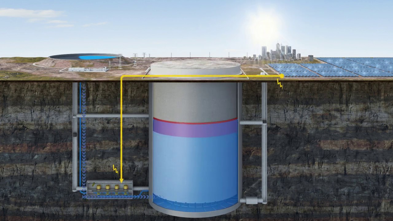 Aus dem Boden wird ein Felszylinder mit einem Durchmesser von 250 Metern und einer Tiefe von 340 Metern herausgefräst. Dieser dient als „Stöpsel“ für das darunter liegende Wasserreservoir. Um Strom zu speichern, pumpt die Anlage Wasser in das Reservoir und hebt damit den Felsen an. Wird der Strom wieder benötigt, sorgt der Zylinder mit seinem Gewicht dafür, dass das Wasser aus dem Reservoir nach oben gepumpt wird und dabei über eine Turbine die Energie erzeugt.