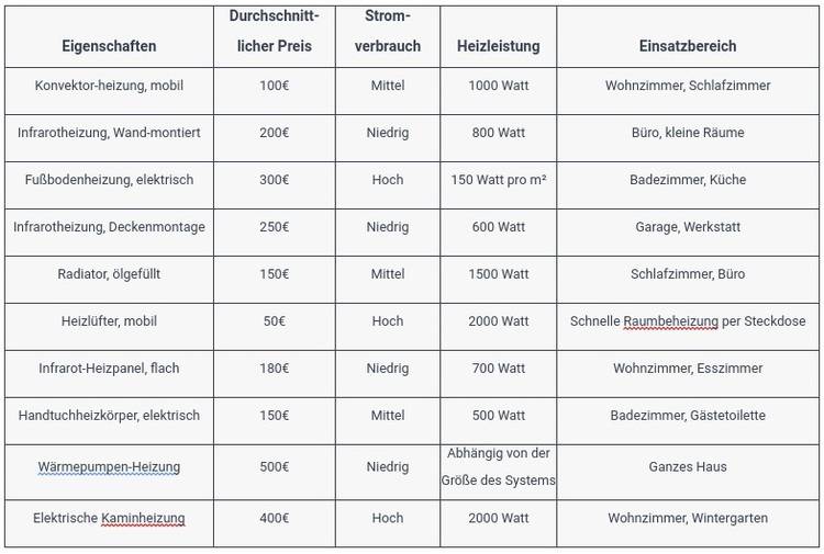 Bitte beachten Sie, dass die Preise, Stromverbrauch, Heizleistung und Einsatzbereiche Durchschnittswerte sind und je nach Hersteller und spezifischer Ausführung variieren können. Es ist ratsam, weitere Informationen zu den einzelnen Modellen einzuholen, um eine fundierte Entscheidung zu treffen.