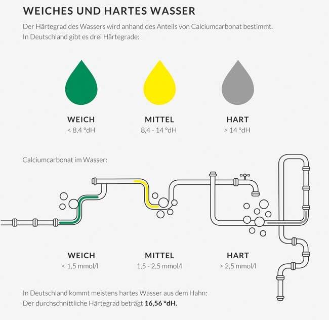 Die Wasserhärte wird von den Wasserversorgern gemessen und üblicherweise in der Einheit "Grad deutscher Härte" (°dH) angegeben. Je höher der Härtegrad, desto höher ist der Gehalt an Calcium- und Magnesiumionen im Wasser.