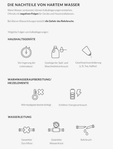 Die Wasserhärte kann je nach Region und Quelle stark variieren. Ablagerungen von Kalk in Rohrleitungen und Geräten verursacht Verstopfungen und führt zu ineffizienten Betrieb. Es kann auch die Reinigungswirkung von Waschmitteln und Seifen reduzieren und die Haut und Haare austrocknen. Weiches Wasser hingegen hat diese Probleme nicht und wird oft als angenehmer empfunden.