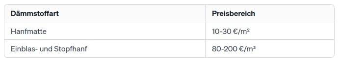 Die Kosten für Hanfdämmung liegen zwischen 10 und 30 Euro pro Quadratmeter für Matten und 80 bis 200 Euro pro Kubikmeter für Einblas- und Schüttdämmstoffe.