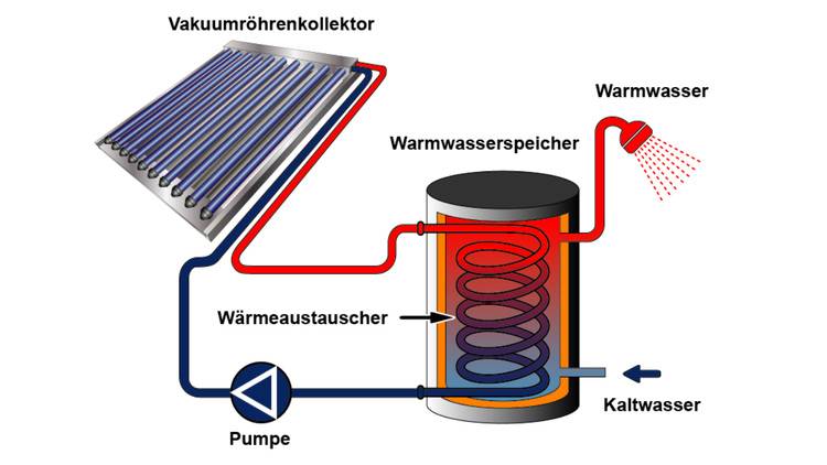 Das Wärmeträgermedium (Alkohol oder Wasser mit Unterdruck) in den Heat Pipes verdampft hier bereits bei geringer Sonneneinstrahlung. Durch die Kondensation wird Wärme freigesetzt, die im Inneren der Röhre aufsteigt und an ihrem oberen Ende an die vorbeiströmende Wärmeträgerflüssigkeit übertragen wird. Während das erzeugte Warmwasser nun im Haushalt gespeichert oder genutzt werden kann, fließt das gekühlte und kondensierte Wärmeträgermedium zur neuen Wärmeaufnahme an seinen Ursprungsort zurück.