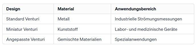 Venturdüsen können in verschiedenen Designs und Materialien hergestellt werden, um spezifische Anforderungen zu erfüllen. Die folgende Tabelle zeigt einige der gängigen Konstruktionen: