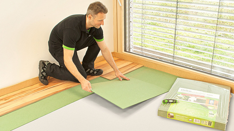 Verwendet werden sollten hier Unterlagen mit einer hohen Druckspannung, auch als CC- oder DL-Wert bezeichnet. Ist der Untergrund im Boden bzw. der Bodenbelag weicher, muss eine höher belastbare Trittschalldämmung gewählt werden.