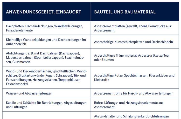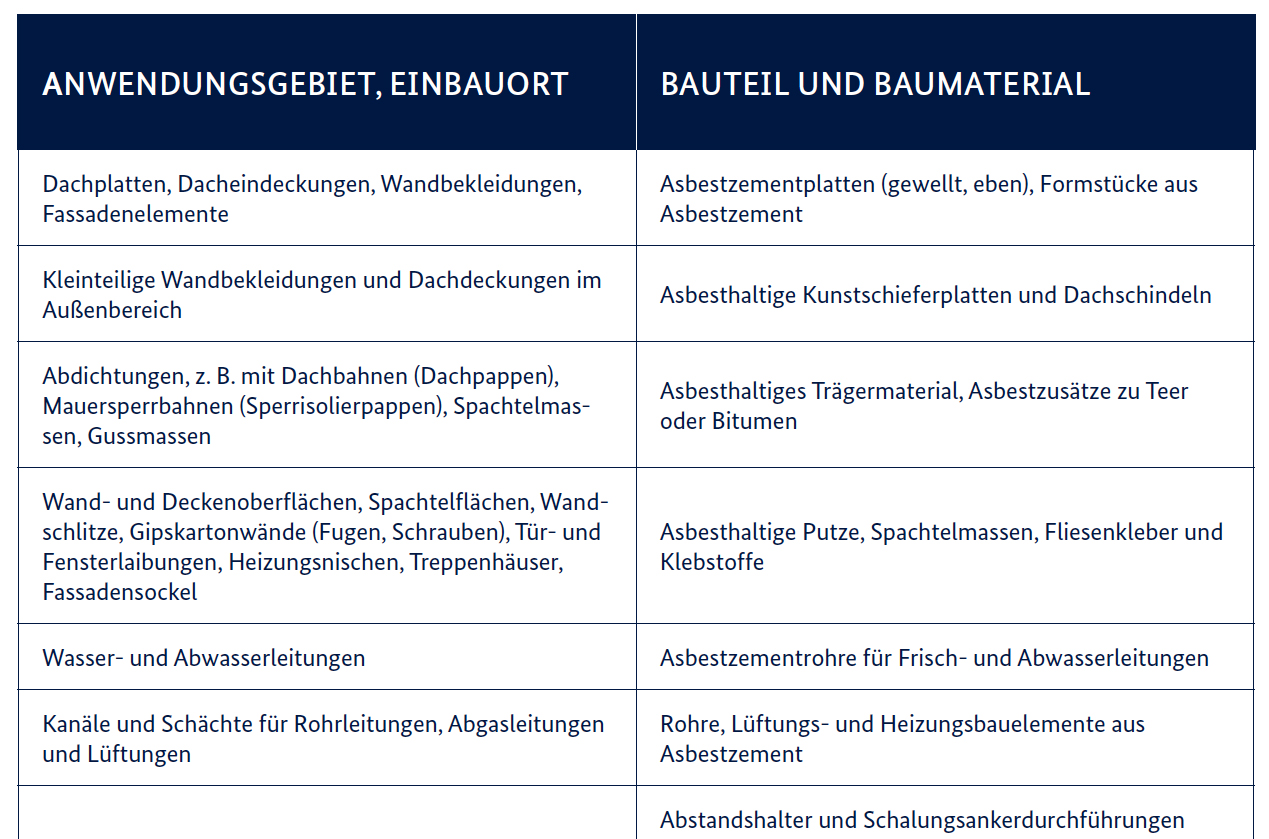 Etwa 84 % des aktuellen Wohngebäudebestandes wurden vor 1993 errichtet. Ca. 90% des Rohasbestes ist für Bauprodukte verwendet worden (BBSR 2011; BG Bau, 2008). Von ca. 3500 Produkten, die aus Asbest in Deutschland hergestellt wurden, wurde ein großer Teil in Industrie- und Wohngebäuden eingebaut. Man geht davon aus, dass in etwa 25% der Gebäude asbesthaltige Baustoffe anzutreffen sind. Um das Risiko zu minimieren, existiert eine neue Leitlinie für die Asbesterkundung.