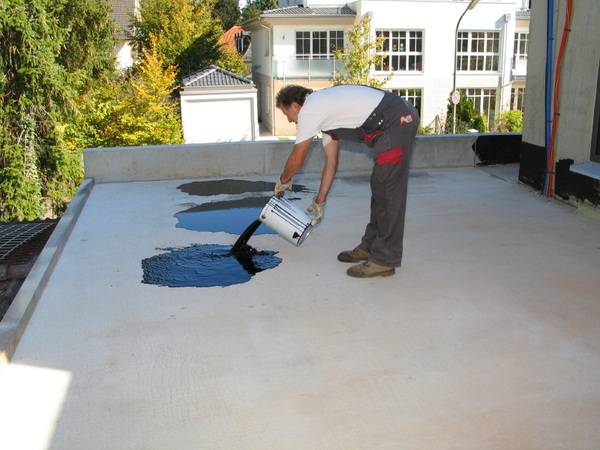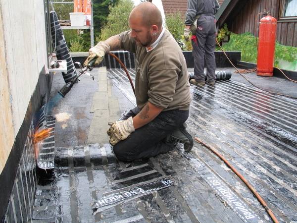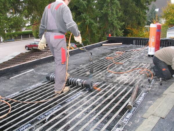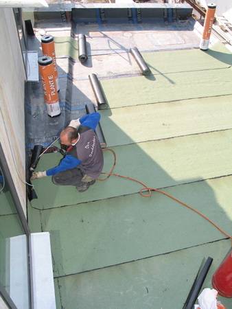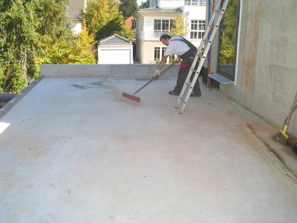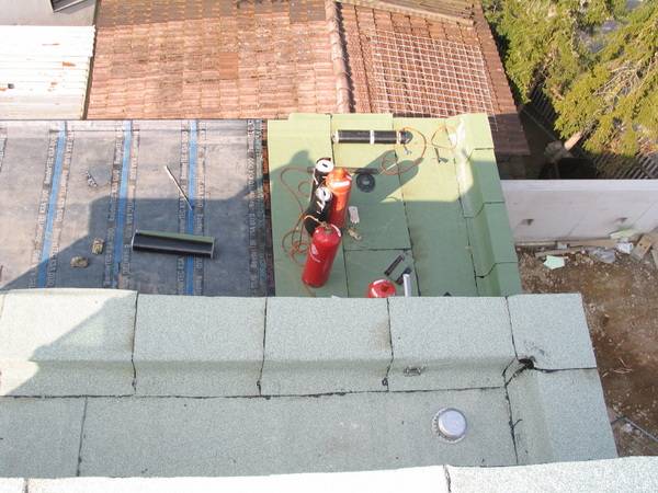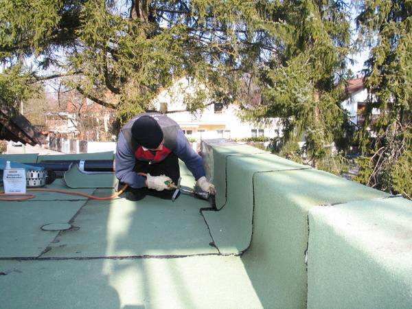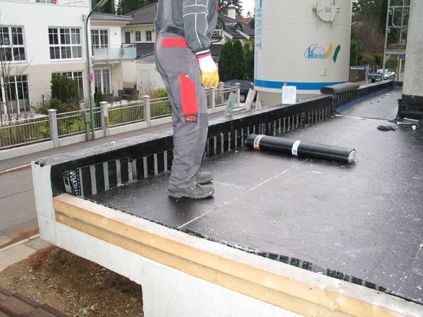 Im ersten Arbeitsschritt wurden die Untergründe für die Wärmedämmung der Flachdächer vorbereitet und gründlich gereinigt, anschließend ein Voranstrich mit Bitumen ausgeführt.