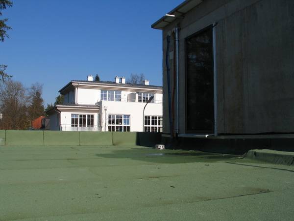 Sowohl beim Dach als auch bei den umlaufenden Terrassen wurde eine Flachdachabdichtungsbahn mit einem breiten Temperaturfenster (Kaltbiegeverhalten der unteren Deckmasse – 40 °C, Wärmestandfestigkeit der oberen Deckmasse bis 150 °C) genutzt. Der Vorteil: Auch nach 10 Jahren ist das Kaltbiegeverhalten der unteren Deckmasse noch besser als bei einer neu verlegten Standardbahn und die Dachabdichtung damit optimiert.