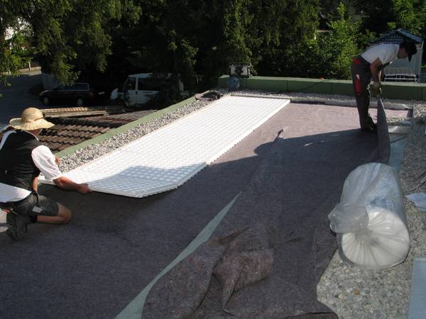 Auf diesen Untergrund kamen EPS-Wasserspeicherelemente mit Drainfunktion und 50 mm Aufbauhöhe (Wasserspeicherplatte WSP 50) mit etwa 20 l/m² Wasserspeichervermögen für die Entwässerung des Gründachs. Auf der Unterseite der Platten finden sich Hohlräume um Überschusswasser vom Flachdach abzuführen. Das Abdecken mit einem Filtervlies verhindert das Eindringen von Schmutz und gewährleistet die dauerhafte Funktion der Drainage.