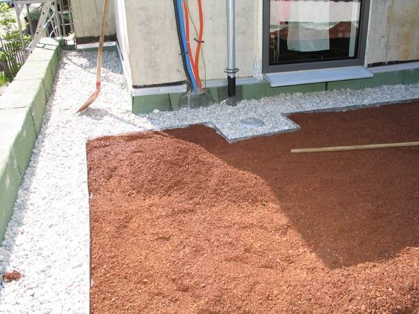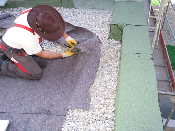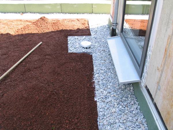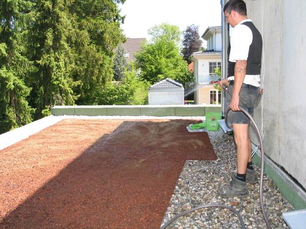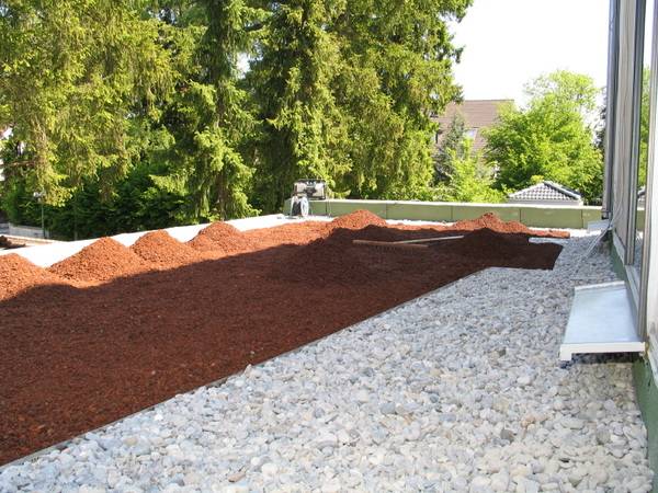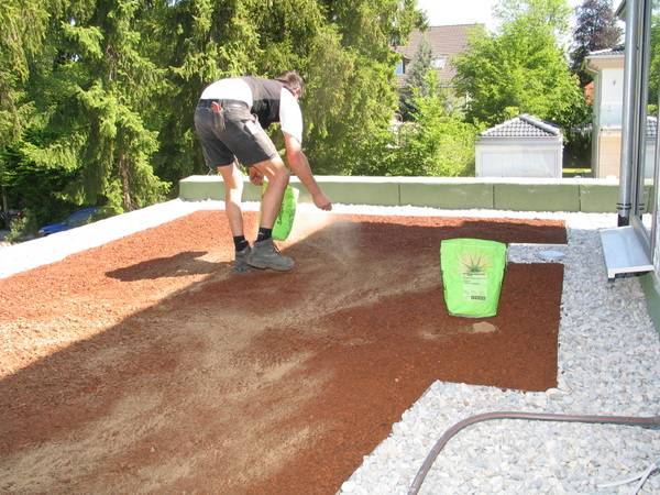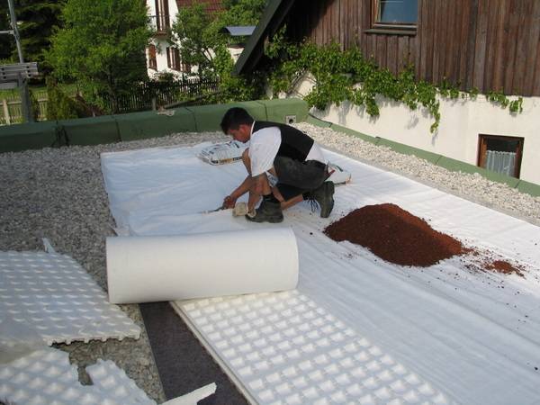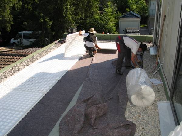 Wie bei der Dachdämmung wurde auch der Aufbau des Gründachs mit den Lösungen von Bauder realisiert. Die Grünfläche auf dem Flachdach wurde mit einer Aluminium-Kiesfangleiste umrandet und mit einer Trenn- und Gleitschicht aus PE-Folie belegt. Darauf wurde ein verfestigtes Schutzvlies verlegt, um die Dachabdichtung vor Beschädigungen zu schützen.