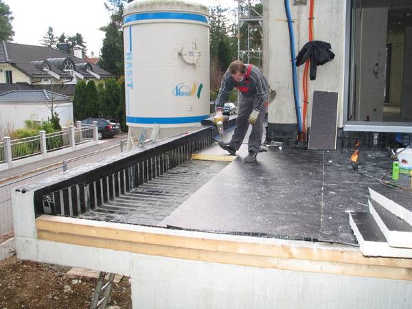 Nach der Trocknung der Bitumenschicht wurde die Dampfsperre aufgebracht. Hier wurde auf einen hohen Diffusionswiderstand und Alkaliresistenz geachtet. Um die Ebene der Dämmung sicher mit der Dampfsperre zu verkleben verfügt diese bereits über sogenannte Thermstreifen.