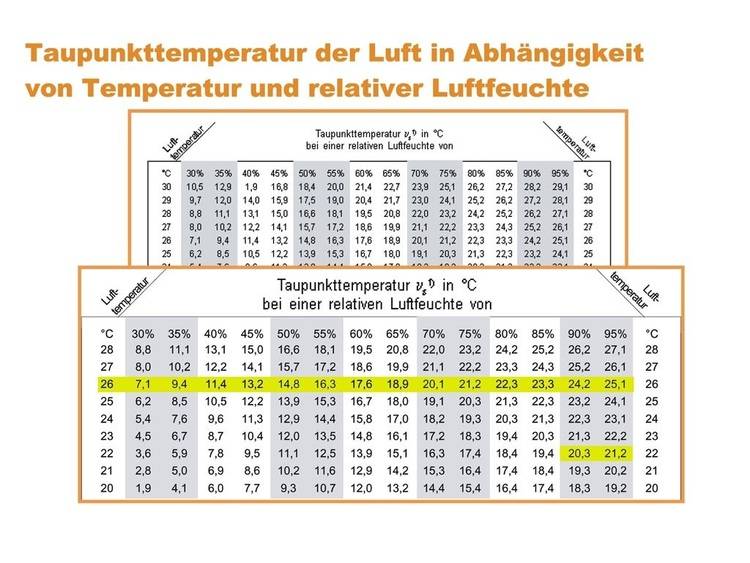 Problematisch ist, dass die kühlere Kellerluft weniger Feuchtigkeit aufnehmen und speichern kann. Das bedeutet: Je wärmer und feuchter die Außenluft und je kälter die Kellerwände, desto mehr Tauwasser fällt sich im Putz und Mauerwerk aus. Ein Beispiel: Bei einströmender Außenluft mit 26 Grad Celsius Temperatur durch die Fenster und 60% relativer Luftfeuchtigkeit liegt die Taupunkttemperatur bei 17,6 Grad Celsius.