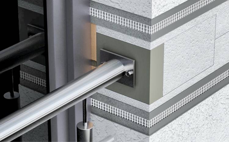 Für die Montage von sicherheitsrelevanten Bauteilen wie französischen Balkonen und anderen Geländern sollten spezielle Montagewinkel aus PU-Hartschaum zum Einsatz kommen. Sie lassen sich direkt in die Dämmebene einbauen und minimieren somit den Wärmeverlust. Zur Befestigung wird der Montagewinkel mit Klebemörtel angesetzt und anschließend verdübelt. Nachdem die Dämmplatten des WDVS angebracht wurden, lässt sich das Material bündig zum Dämmstoff einkürzen und mit dem System verputzen. Das Anbauteil wird später durch die Putzschicht im Montagewinkel befestigt.