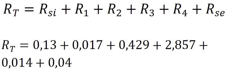 Umgangssprachlich könnte man sagen: Addiere alle Einzelwiderstände zu einem Gesamtwiderstand (RT) auf. Die Einzelwiderstände setzen sich zusammen aus dem ersten (Rsi) und letzten (Rse) vom gleichen Typ, sowie die „Schichtwiderstände“ 1 (R1) bis zur letzten (n-ten) Schicht (Rn).