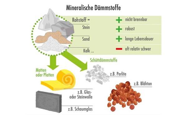 Anorganische Materialien wie Sand, Stein, Vulkangestein, Altglas und Kalk sind die Ausgangsstoffe, aus denen mineralische Dämmmaterialien wie Glas- und Steinwolle, Schaumglas, Perlite, SLS 20, Calciumsilikat und Mineraldämmung hergestellt werden. Zu ihren Pluspunkten zählen unter anderem ihre hohen Dämmwerte, ihre guten Brandschutzeigenschaften und ihr positiver Einfluss auf das Raumklima. Mehr zu Mineralische Dämmung.Naturnahe Dämmstoffe