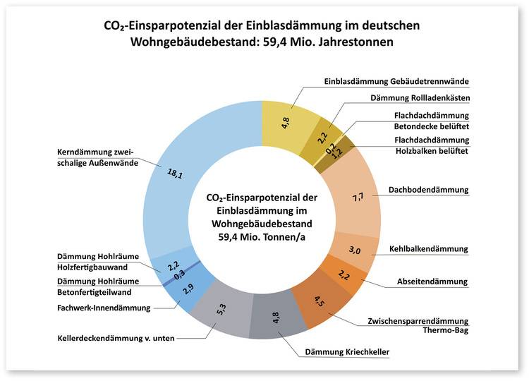 In Deutschland dauerte es hingegen einige Zeit, bis sich die Einblasdämmung zu etablieren begann. Was auch an der Baumystik mit ihren wandernden Taupunkten und Belüftungsregeln lag, die neben der Innendämmung auch diese smarte Dämmtechnik problematisierte. Während holländische Firmen ihr Angebot europaweit ausweiteten, engagiert sich hierzulande eine kleine, aber wachsende Anzahl von Firmen im Fachverband Einblasdämmung, um diese Dämmtechnik bekannter zu machen. Die Ergebnisse einer im Auftrag des Fachverbandes erstellten Studie belegen: Die Einblasdämmung birgt für die energetische Ertüchtigung von Steildächern, Flachdächern Außenwänden und Kellerdecken im Wohngebäudebestand ein erhebliches CO2-Einsparpotenzial von über 59 Mio. Tonnen pro Jahr, was den Treibhausgasausstoß aus der Raumheizung um 25 Prozent senken würde [2]. Ihr zusätzlicher Einsatz im Nichtwohnbau steigerte die Einsparung auf 32 Prozent (Abb. 1).