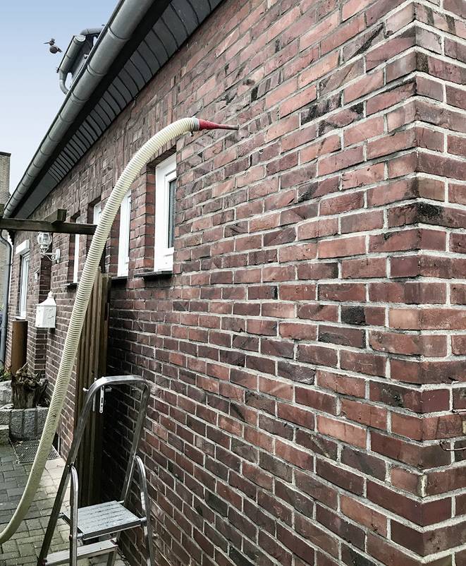 Die Potenziale der Einblasdämmung für den Klimaschutz sind beachtlich: Die unkomplizierte und kostengünstige Dämmtechnik verbessert die Gebäudeeffizienz sowohl im Neubau als auch im Bestand – wobei sie sich gerade in komplizierten Situationen zu bewähren weiß. Dieser Einsicht folgend, förderte die Niederlande schon ab der Energiekrise 1974 die Kerndämmung zweischaliger Außenwände. Im Norden Europas kommt dieser Wandaufbau auf einen Anteil von etwa 30 Prozent, in den Niederlanden liegt er sogar über 60 Prozent [1]. In unserem Nachbarland erzwingt heute das zur Neige gehende Groninger Erdgasfeld den bestmöglichen Gebäudewärmeschutz. Nur ein sehr niedriger Heizenergieverbrauch erschließt die Möglichkeit, das versiegende Heizgas bzw. das Ende des fossilen Zeitalters durch erneuerbare Energien zu ersetzen. Die vorhandene Kerndämmung unterstützt die Wirkung der Außendämmung, indem die verfüllte Luftschicht ihre Kaltluft-Hinterströmung verhindert.