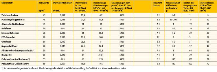 Es stehen zwölf Dämmstoffarten in loser Faser-, Flocken-, Granulatform und für besondere Fälle auch flüssiges Polyurethan als Gieß- oder Sprühschaum zur Auswahl. Der geringe Aufbereitungsgrad des losen Dämmmaterials reduziert den einmal anfallenden Herstellungsenergieaufwand. Entscheidend ist jedoch die Bilanz mit dem jährlich wiederkehrenden Einspareffekt der Dämmung (Abb. 2).