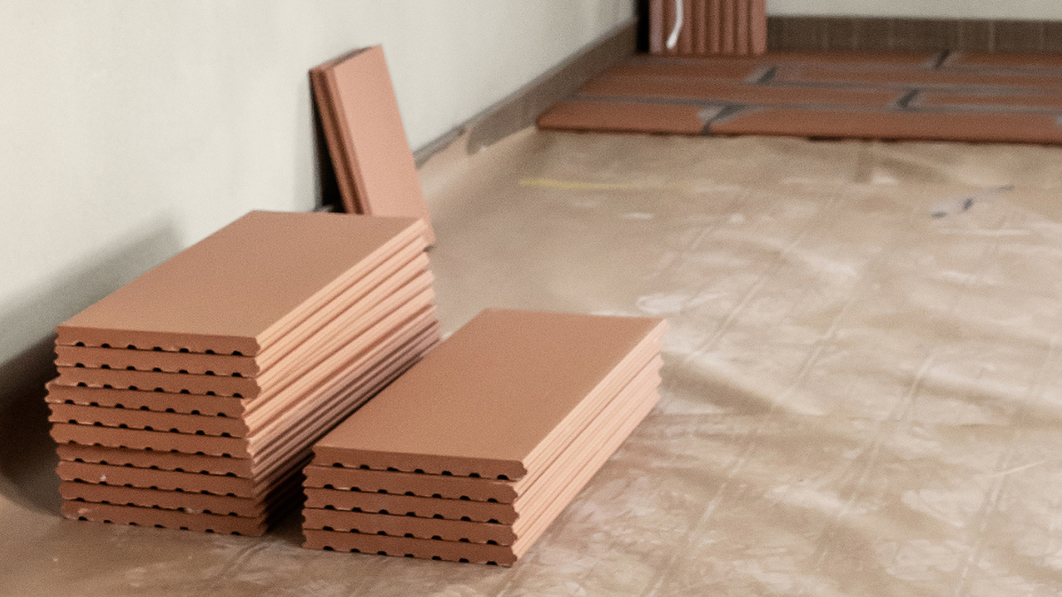 Statt Nassestrich kamen bei dem Landshuter Neubau zudem knapp 900 Quadratmeter Estrichziegel von Leipfinger-Bader zum Einsatz. Dabei handelt es sich um einen keramischen Trockenestrich, der standardmäßig über das Format 200 mal 555 Millimeter und eine Stärke von nur 18 Millimetern verfügt. Damit eignet er sich – neben Neubauten – besonders auch für Sanierungsprojekte, bei denen die Aufbauhöhe aus Platzgründen minimiert werden muss.