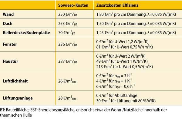 Direkten Bezug hat das Energieinstitut auf eine ältere Publikation [10] des Gründungsmitglieds Dietmar Walberg der Initiative genommen, auf die im Hintergrundpapier verwiesen wird: „Die in einer vielbeachteten deutschen Studie publizierten Mehrkostenangaben in Höhe von bis zu 26 % sind nicht nachvollziehbar.“, heißt es dort. In der Studie „Der Weg zu einem klimaverträglichen Gebäudebestand“ [11] wiederum listet das Passivhaus-Institut die teils minimalen „Zusatzkosten Effizienz“ auf, bezogen etwa auf Wand, Dach, Fenster, Luftdichtheit (siehe Tabelle).