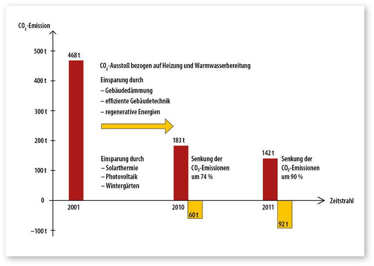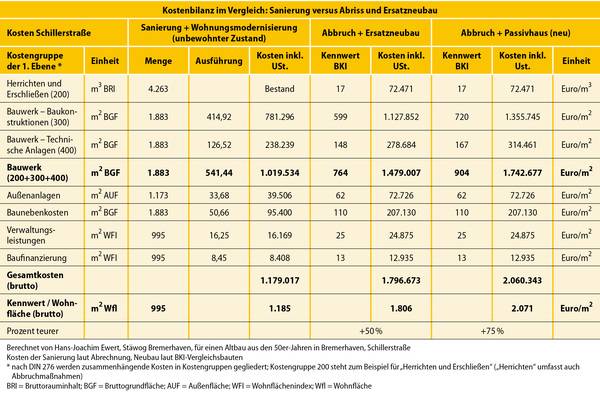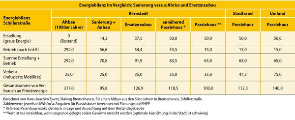 Den Gegenbeweis trat der Architekt Hans-Joachim Ewert durch eine vergleichende Bilanz der Bau- und Energiekosten an: Als Beispiel diente ihm der Umbau eines Zeilenbaus aus den 1950er Jahren in der Bremerhavener Schillerstraße unweit der Wulsdorfer Siedlung. Sein Fazit: Die Energiebilanz spricht umso deutlicher für eine Sanierung, desto mehr Aspekte sie berücksichtigt. Rechnet man den Energiebedarf für Abriss und Neubau mit ein und nimmt noch die Belastungen durch den Verkehr (induzierte Mobilität [8]) hinzu, die zum großen Teil vom Standort eines Hauses abhängen und insbesondere im Umland zu Buche schlagen, schneidet die Sanierung inklusive Anbau deutlich besser ab als ein Neubau, sogar wenn dieser Passivhausniveau erreicht.