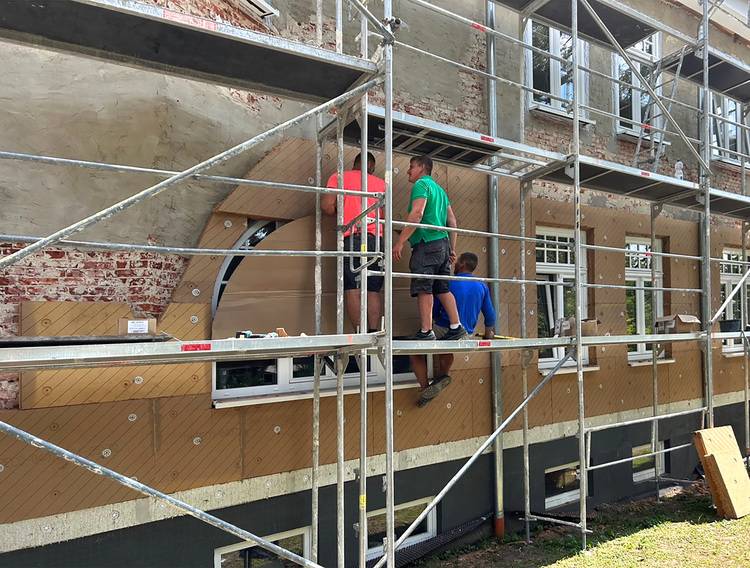 Was überraschte: Der Bau verfügt über ein zweischaliges Mauerwerk, bestehend aus zwei Ziegelwänden einer Stärke von 24 Zentimetern (außen) und elf Zentimetern (innen). Der neun Zentimeter starke Hohlraum wurde bei der Sanierung mit einer Einblasdämmung verfüllt. Außen fiel die Wahl auf das Dämmsystem UdiReco. Die 100 Millimeter dicken Holzfaserplatten können Unebenheiten im Untergrund ausgleichen.