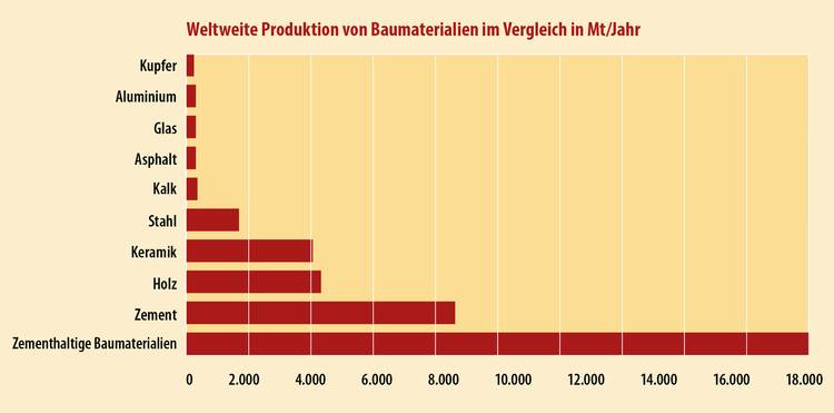 Auf Beton zu verzichten ist dabei keine realistische Option, wie Abb. 1 zeigt. Zementbasierte Baustoffe, ob nun Beton, Mörtel oder Kunststeine, sind als Massenprodukte nicht einfach substituierbar, den Alternativen wie Lehm, Ziegeln oder den hybriden Holzbauten mit hohem mineralischem Baustoffanteil fehlt hierzu das Potenzial. Und wollte man anstatt der weltweit jährlich benötigten 18 Milliarden Tonnen zementhaltiger Baustoffe zum Beispiel konsequent Holz verwenden, wären mehr als 40 Milliarden Kubikmeter davon erforderlich, das Zehnfache der heutigen globalen Holzentnahme [3].