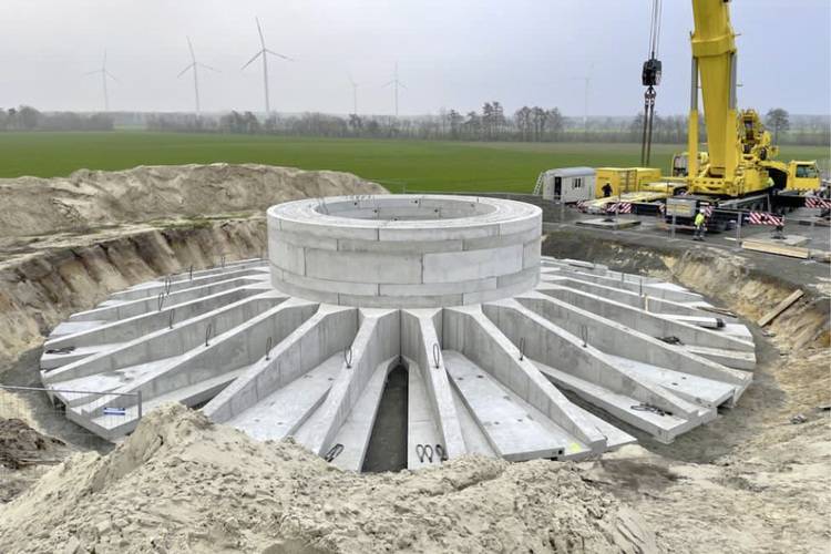 Auch für den Bau von Windrädern gibt es eine entsprechende, ressourcensparende Methode, nach dem Prinzip der Bionic Technology erdacht und umgesetzt vom Unternehmen Smart & Green Anker Foundations: Rippenelemente als Betonfertigteile ersetzen das bisher vor Ort gegossene Fundament aus gewöhnlich circa 1.300 Kubikmetern armiertem Ortbeton (Abb. 5) . Das mit dem Deutschen Nachhaltigkeitspreis 2023 ausgezeichnete Konzept kommt mit bis zu 70 Prozent weniger Beton beziehungsweise Zement sowie Bewehrungsstahl aus. In Summe beträgt die CO2-Einsparung bis zu 80 Prozent. Die Materialien werden auf Standard-LKW angeliefert (40 LKW anstatt wie bisher 130), innerhalb einer Woche aufgebaut, senken die Baukosten signifikant und erleichtern den Rückbau. Die Wiederverwendung des Fertigteilfundamentes ist möglich. Betoneinsparung durch neues Design wird, ähnlich der Heizenergieeinsparung, eine Dienstleistung von Architekten und Ingenieuren, mit der hier und heute Beiträge zur CO2-Minderung geleistet werden.
