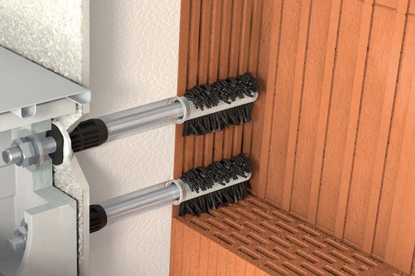 Die Verwendung einer Ankerstange aus Edelstahl A4 minimiert den Wärmedurchgangskoeffizienten auf 0,01 W/K. Die Gewindestange aus A4 reduziert nicht nur den Energieverlust, sondern ist korrosionsbeständig und vermeidet Rostflecken und -nasen an der Fassade. Der Ringspalt zwischen der Gewindehülse Iso-Spacer und der Fassadenoberfläche wird mit dem Spezialdichtmittel Aqua-Stop gegen Feuchtigkeit abgedichtet.