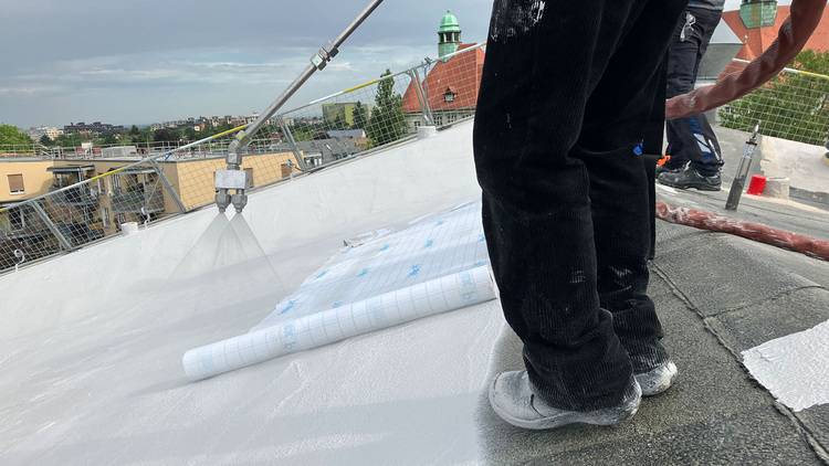 Sprühapplikation bei geneigten Dächern? Kein Problem.