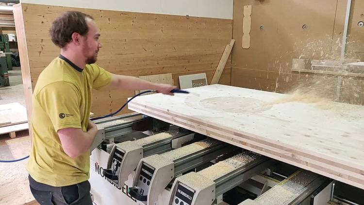 Die Idee, mit akustischen schwarze Löchern in Holzbauten zu experimentieren, kam Stefan Schoenwald während der Arbeit. Er bat seinen Kollegen Vallely, die schallmindernde Wirkung am Computer zu simulieren und durchzurechnen. Um statische Bedenken aus dem Weg zu räumen, wurde Andrea Frangi, ein Holzbau-Experte der ETH Zürich, nach seiner Einschätzung gefragt. Nicht nur dessen Rückmeldung, sondern auch die Modellierung der Schallminderung am Computer war vielversprechend. Also gab Schoenwald einen Prototyp und eine normale Kontrollplatte aus dem gleichen Material bei der Strüby AG in Seewen in Auftrag. Mit einer CNC-Maschine fräste der Holzbau-Spezialist Alex Bellmont dort die linsenförmige Kuhle massgenau aus einer Brettsperrholzplatte. «So ein Auftrag ist zwar nicht sehr schwierig, aber dafür umso spannender», sagt der Maschinist, «ich habe noch nie etwas hergestellt, an dem dann geforscht wird.»