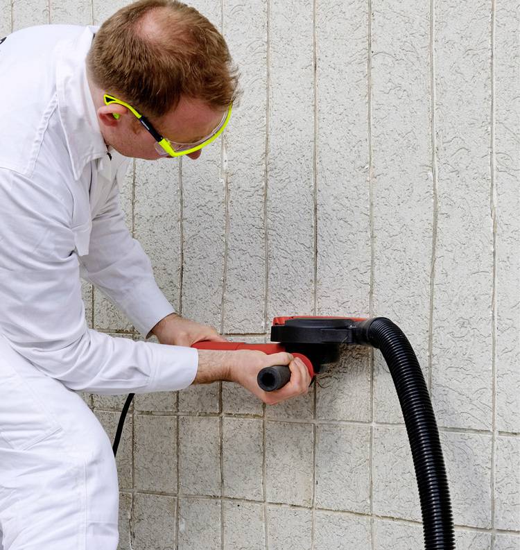 Der dabei entstehende Staub wird sofort von einem angeschlossenen Staubsauger aufgefangen. Anschließend wird ein mineralischer Spezialmörtel vollflächig aufgebracht (Abb. 1). Die geschlitzte Alt-Fassade vergrößert die Klebefläche um bis zu 30 %, wodurch der nachfolgend aufgetragene Armierungsmörtel wesentlich besser haftet.