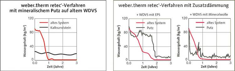 Im Falle einer Durchfeuchtung des Alt-Systems empfiehlt sich bei der Aufdoppelung ein möglichst diffusionsoffener Aufbau, damit die Konstruktion schnell austrocknet und effizient dämmt. In den vergangenen Jahren wurden immer wieder Feuchtegehalte von bis zu zehn Volumenprozent in alten geschädigten WDVS festgestellt.