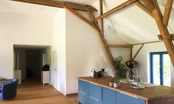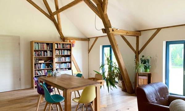 Der Raum erstreckt sich auf 140 Quadratmetern über das ganze Obergeschoß und reicht nach oben bis zum First. Dadurch ist auch die imposante Balkenkonstruktion, die das Dach trägt, offen zu sehen. So präsentierte sich der Heuboden eines ehemaligen Kuhstalls aus dem 19. Jahrhundert im Altenburger Land (Thüringen), als Familie Geißler ihn zum ersten Mal besichtigte.