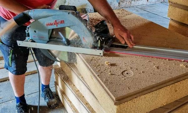 Die Dämmplatten wurden an den Außenmauern des Heubodens auf einer Fläche von 200 Quadratmetern und in einer Stärke von 14 Zentimetern angebracht – ohne Unterkonstruktion oder Klebstoff. Für diese Aufgabe benötigten die Zimmerleute etwa einen Monat.