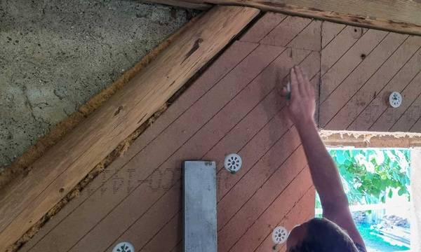 Der teilweise abgebröckelte zementhaltige Putz musste nicht abgeschlagen werden. Wäre er gipshaltig gewesen, hätten die Putzreste erst entfernt werden müssen. Denn Gips zieht Feuchtigkeit und birgt deswegen die Gefahr der Schimmelbildung. Auch die Balken der Außenmauer mussten nicht weiter bearbeitet werden. Die Holzfasern der Dämmung nehmen Feuchte aus dem Mauerwerk auf und geben sie an die Luft ab, so dass das Holz vor Nässe geschützt ist. Andernfalls hätten die Balken aufwendig in Folie verpackt werden müssen.