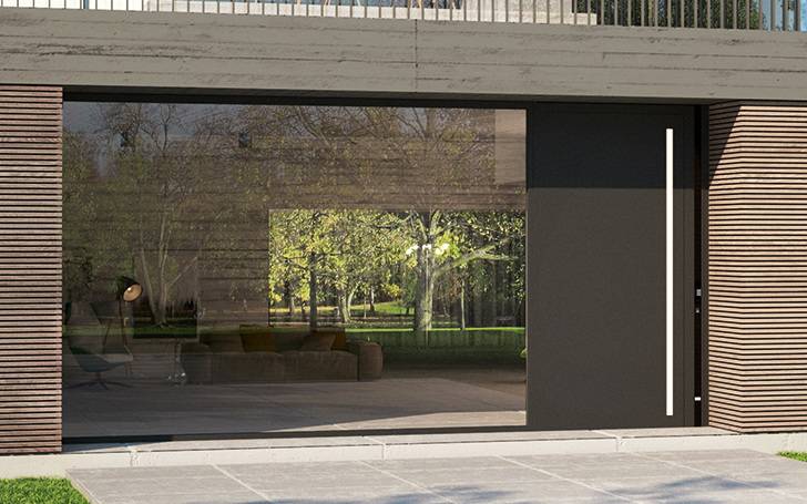 Flächenbündige Einheit von Tür und Griff: Die Haustür zeichnet sich durch eine profilintegrierte beleuchtete Griffmulde und eine beidseitig flügelüberdeckende Türfüllung aus Aluminium aus.