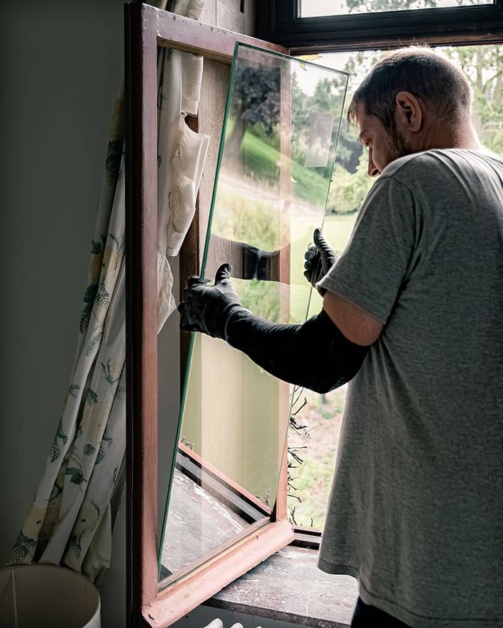 Der rund zwei Wochen andauernde Glastausch erfolgte in alter, handwerklicher Tradition: Nach dem Fräsen und Reinigen der bestehenden Falze wurde zum Einsetzen der Gläser klassischer Leinölkitt aufgetragen. Zum Abschluss wurde die Lackoberfläche fachgerecht wiederhergestellt. Lediglich in wenigen Fällen war es erforderlich, die Fensterflügel auszubauen, um bestimmte Fräsarbeiten effizienter durchführen zu können. „Unser Ziel ist es immer, die ursprüngliche Ästhetik der Rahmen zu bewahren und kein zusätzliches Material zu verwenden“, erklärt Vanassche. „Der Dämmwert und die Dicke ermöglichen uns, einen Glasaustausch anzubieten und dabei die Ästhetik des Rahmens zu 100 Prozent zu erhalten.“
