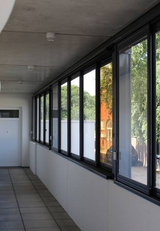 Gekoppelt ist das Access-System mit Rauchmeldern, die im Deckenbereich des Laubengangs montiert und technisch auf die Verglasung abgestimmt sind. Ist eine bestimmte Rauchkonzentration überschritten, senden sie ein Signal und lösen das Öffnen der Schiebeelemente aus. Unabhängig davon lassen sich letztere auch – beispielsweise zum Lüften im Alltag – manuell über die Betätigung eines Schalters öffnen. Auch im Falle eines Stromausfalls ist das System sicher, da die Öffnungsfunktion weiterhin durch den Betrieb mit Schwachstrom gegeben ist.