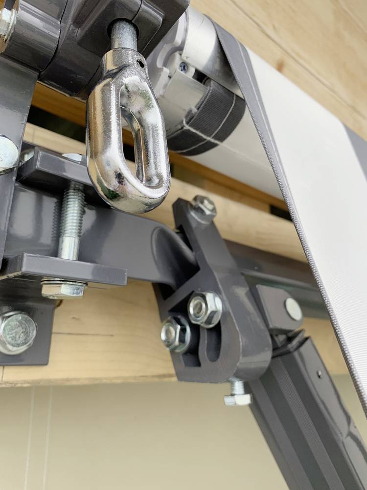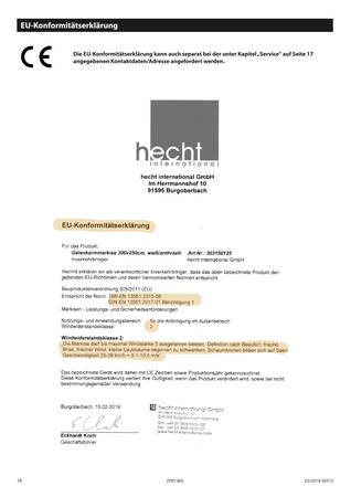 Die Sicherung mit Scheibe und Mutter ist so nicht möglich, weil die Scheibe nicht in die obere Nut passt. Löst sich die Mutter bei der Benutzung der Markise, kann die Schraube z.B. nach unten herausfallen und so das Tragrohr aus der Halterung gleiten lassen. Positiv ist anzumerken, dass die Wartungsanleitung sehr detailliert auf das Thema Wartung eingeht. Ein interessantes Detail ist die Tatsache, dass die Anleitung aus dem Internet eine EU-Konformitätserklärung enthält und die im Markisenkarton beigefügte Anleitung nicht.