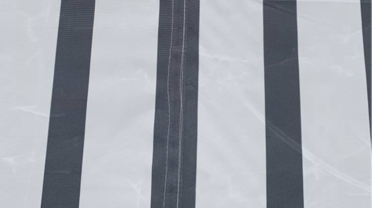 Die gelieferten Markisen waren jeweils mit einem Polyestergewebe in weiß-grauen Blockstreifen bespannt. Bereits beim Auspacken aus der Schutzfolie im Markisenkarton konnten sehr deutliche Knick-, Lege- und Handlingsfalten auf der Tuchwelle identifiziert werden, die nach der Montage und dem ersten Ausfahren in einer erschreckenden Menge erkennbar waren. Besonders für eine mögliche Neubespannung der Markise ist dies relevant.