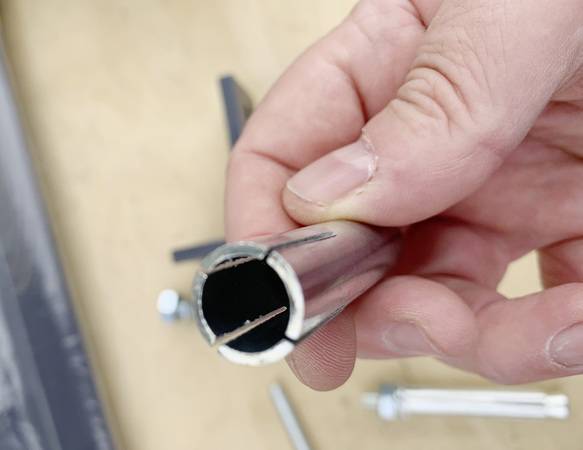 Äußerst gefährlich wird es bei dem beigefügten Montagematerial der Markise. Die optisch auf „Schwerlastdübel“ getrimmten Pseudo-Befestigungsmittel sind den Begriff Dübel überhaupt nicht wert und vollkommen ungeeignet, eine Markise sicher zu befestigen. Besonders deutlich wird das angesichts der von Hand eingesägten Spreitz-Schlitze in der Aluminiumhülse. Einen Beipackzettel mit Verarbeitungshinweisen oder die Angabe von Traglasten sucht man vergebens. Einzig in der Gebrauchs-/Wartungsanleitung gibt es ein Kapitel zur Befestigung der „Wandanker“.