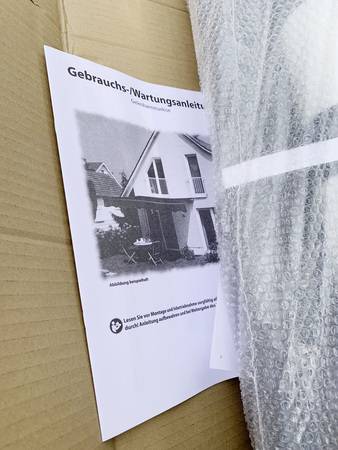 Auf den ersten Blick macht die im Markisenkarton beigelegte Anleitung einen soliden Eindruck, der sich beim genauen Studium aber genauso schnell wieder verflüchtigt. Viele unpräzise Angaben reihen sich aneinander, eine Benutzung der Markise bei Regen und Wind wird zum Beispiel mehrfach verboten, ohne genauere Angaben zum Gefälle der Markisen oder zu zulässigen Windgeschwindigkeiten zu machen. Die Sicherungsschraube der Markisenkonsole ist z. B. nicht so wie in der Zeichnung beschrieben von oben einzuführen und von unten mit Mutter und Scheibe zu sichern, sondern kann aufgrund der Konstruktion nur von unten eingeschoben werden.