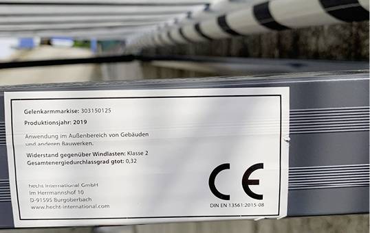 Auf dem am Markisenarm angebrachten CE-Zeichen wird auch der Normenstand 2015 ausgewiesen, zusätzlich zur Windwiderstandsklasse 2 der Gesamtenergiedurchlassgrad gtot von 0,32. Beide Angaben wären geeignet gerichtlich vorzugehen, da die hier notwendige Leistungserklärung und das CE-Zeichen nach der Normenversion 2009 erstellt werden müssen. Eine Konformitätserklärung ist wegen der Handkurbel gar nicht erforderlich. Zusammen mit den Testergebnissen darf die Markise kein CE-Zeichen tragen.