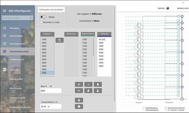 Hinzu kommt, dass sich alle Eingaben direkt am Bildschirm über grafische Anzeigen von Schachtgrundriss, Höhenschnitt und Triebwerksraum interaktiv verfolgen und überprüfen lassen. „Bei anderen Planungstools ist es dagegen üblich, dass die Zeichnung erst dann vollständig für den Nutzer sichtbar wird, wenn das CAD-Modell, das daraus entstehen soll, fertig ist“, erklärt Steinmetz.