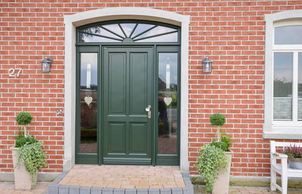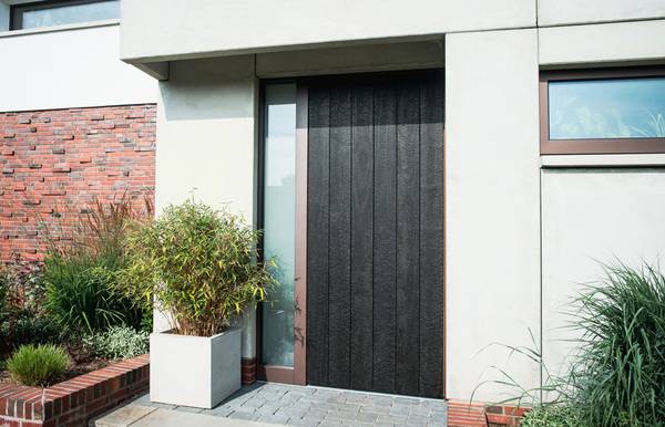 Auch der Materialmix von Holz und Aluminium liegt im Trend: im Innenbereich der warm anmutende Charakter von Holz, auf der Außenseite das wetterfeste Aluminium. Ebenfalls hochaktuell sind große Anlagen mit Glas-Seitenteilen. Sie bringen mehr Licht ins Haus und lockern den Eingangsbereich optisch auf.