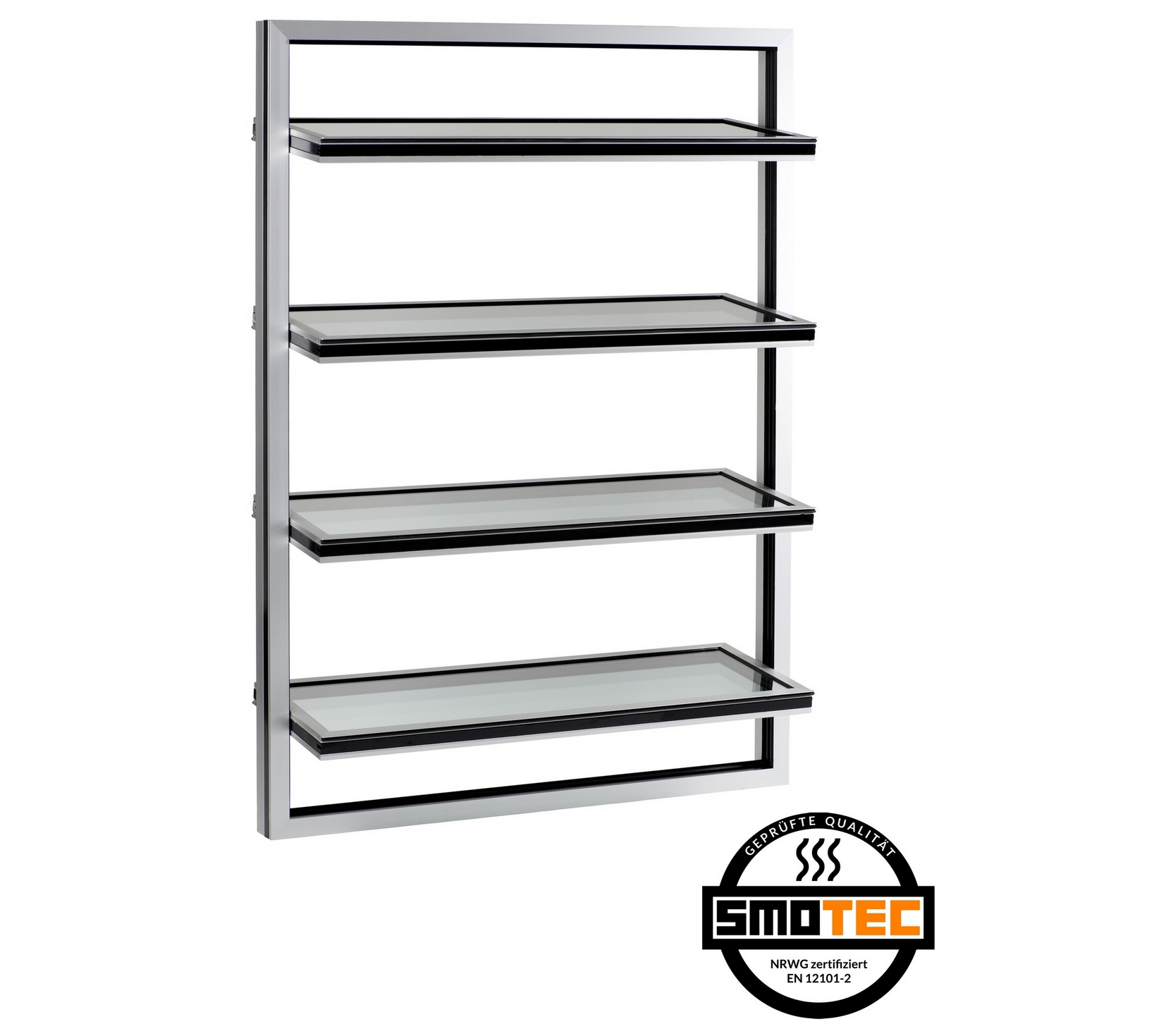 Bei den Lamellenprodukten von Fieger lässt sich pro Fenster eine Fläche von bis zu drei Quadratmetern gleichzeitig öffnen. Die Fenster sind mit dem Smotec-Siegel gekennzeichnet und als NRWG zertifiziert.