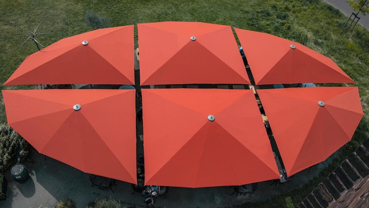 Zum Einsatz kommen dabei sechs individuell gefertigte Großschirme vom Typ Big Ben Freestyle – eine Lösung, die sowohl funktional als auch ästhetisch überzeugt. Vier der Schirme mit asymmetrischem Zuschnitt und einer Seitenlänge von bis zu 6,55 Metern wurden passgenau an den Seitenbereichen der Terrasse installiert, zwei weitere mit einer Seitenlänge von 5,28 Metern decken die zentrale Fläche ab – so ist der gesamte ovale Platz optimal verschattet.