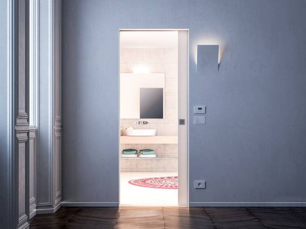Nach dem Einbau wird der Schiebetürkasten nur einlagig beplankt beziehungsweise verputzt. Zusätzlich zur Montage in Trockenbaukonstruktionen ist das System Luce auch in einer Variante für Massivwände erhältlich. Alle Eclisse-Einbauelemente verfügen über eine über den Durchgang einstellbare “Zunge”, mit der die Endposition des Türblattes festlegt wird. So können die Türen bündig in die Wandtasche eingeschoben werden und verschwinden damit aus dem Sichtfeld.