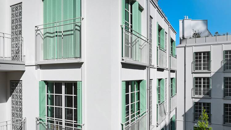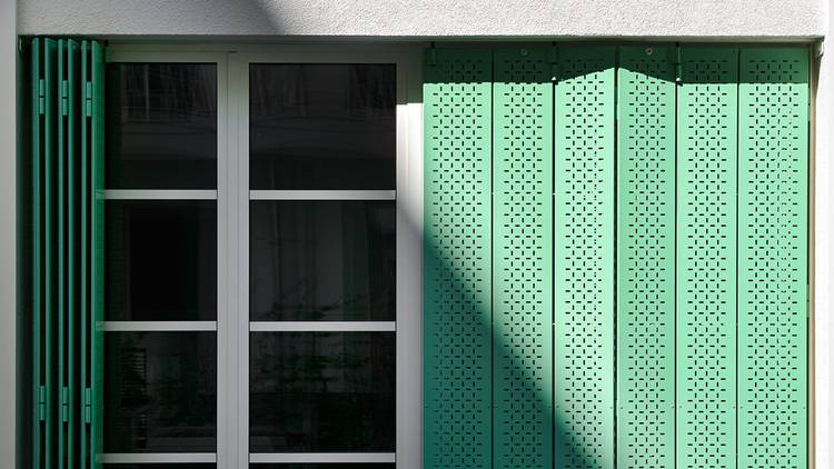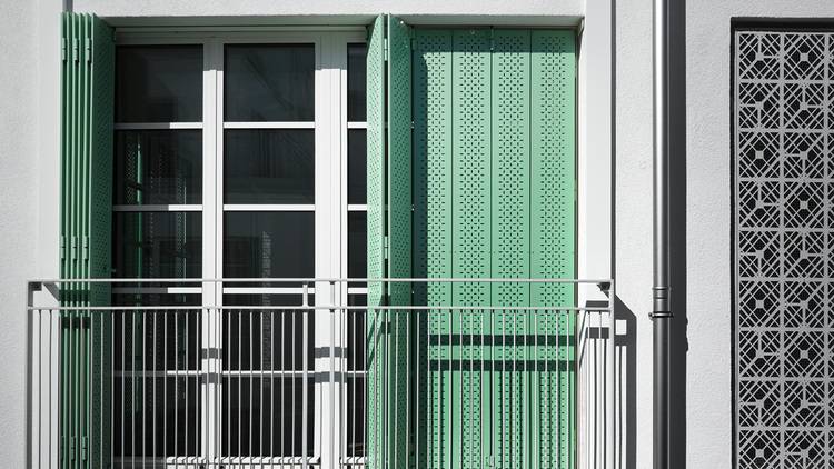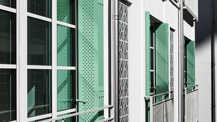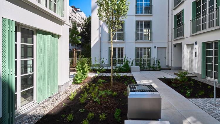 Um die natürliche Atmosphäre des Innenhofs aufzunehmen, wurden die Faltläden in einem zurückhaltenden Lindgrün (NCS S 2020-G10Y) ausgeführt. Gemeinsam bilden Fassaden und Begrünung so einen entschleunigenden Gegenpol zur hohen urbanen Verdichtung.